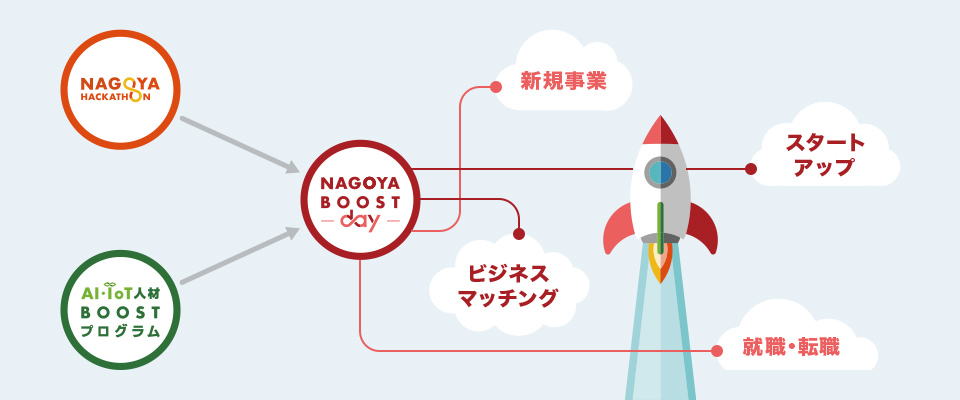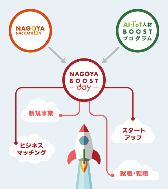 NAGOYA BOOST DAYは、NAGOYA HACKATHONとAI・IoT人材BOOSTプログラムで生まれた成果をプレゼンテーションするものであり、新規事業発掘、事業マッチング、人材発掘、スタートアップ発掘など、NAGOYA BOOST 10000で生まれたアイデアと人材が、次のステップに進む土台作りとしての役割を担う取組みです。また、最新テクノロジーを有する国内外の企業にも登壇してもらい、新たなビジネスチャンスを掴む場を提供します。