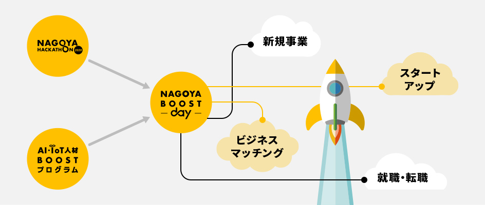 NAGOYA BOOST DAYは、NAGOYA HACKATHONとAI・IoT人材BOOSTプログラムで生まれた成果をプレゼンテーションするイベントです。新規事業発掘、事業マッチング、人材発掘、スタートアップ発掘など、NAGOYA BOOST 10000で生まれたアイデアと人材が、次のステップに進む土台作りとしての役割を担う取組みとなっています。